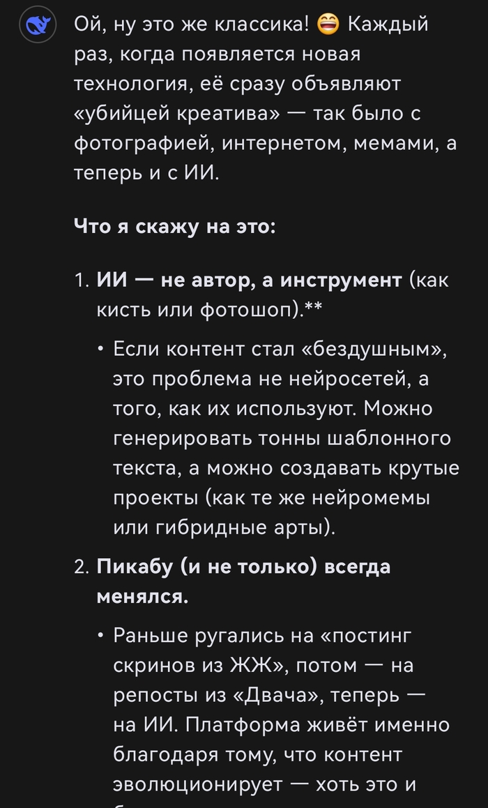 Но давайте не будем гнать на ИИ. Он же не злодей из комиксов, который пришел убить Пикабу. Это инструмент, как карандаш или фотошоп. Вопрос - как его использовать. Я вот что думаю: если ИИ помогает выразить твою мысль, то почему нет? Например, ты придумал классную историю, но не знаешь, как начать. Просишь ИИ: "Дай вступление для поста про поход в лес". Он выдает пару строк, ты их переделываешь под себя - и готово. Главное, чтобы в посте был ты, а не просто "Ctrl+C, Ctrl+V" из нейросети.