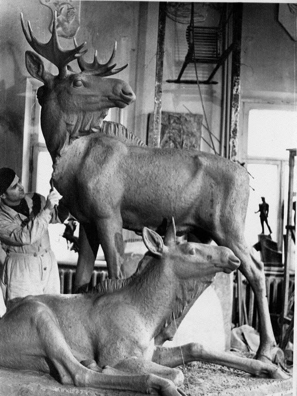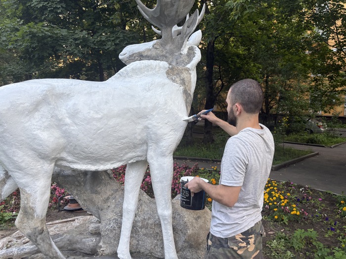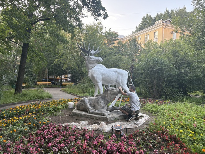 На пешеходной дорожке можно увидеть композицию «Пионерка», а во дворе колледжа №8 — скульптуру «Девочка с ланью». В центре одной из клумб расположена скульптурная группа «Лоси», созданная известным скульптором-анималистом Георгием Николаевичем Попандопуло. Именно о реставрации этой композиции пойдет речь в данной статье.