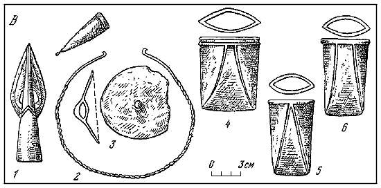 В — предметы из Пустых Морквашей, найденные до раскопок 1927 г.: 1–3 — из публикации А.М. Тальгрена; 4–6 — из коллекций археологического кабинета КГУ. Бронза.