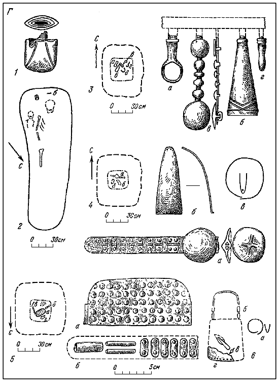Г — погребения и вещи, вскрытые в 1975 г.: 1 — кельт из погребения 19; 2 — погребение 24; 3 — погребение 20 (а, б, в, г — подвески поясного набора; д — зубы человека); 4 — погребение 22 (а — украшения налобной повязки; б — пластинка шапки; в — височное кольцо); 5 — погребение 23 (а — детали налобной повязки); 6 — погребение 24 (а — височное кольцо; б — пронизки и ремешок от ручки кошелька; в — бронзовый наконечник стрелы; г — дно берестяного кошелька).
