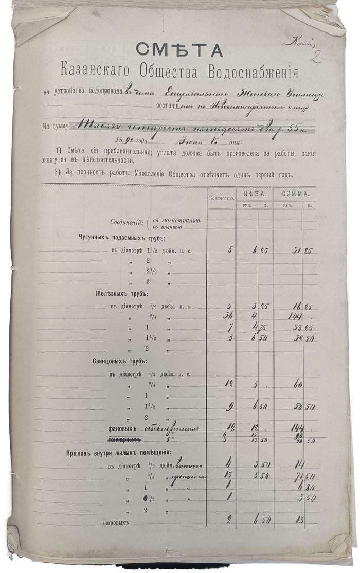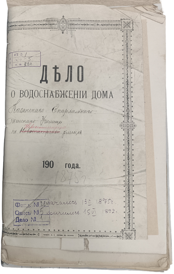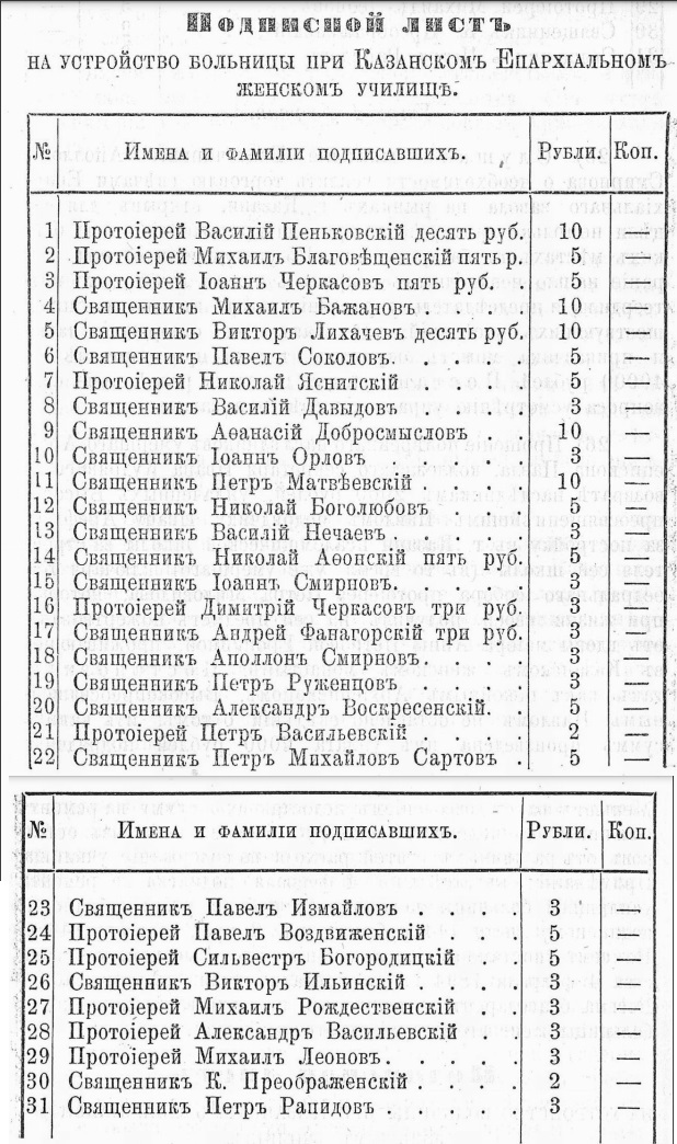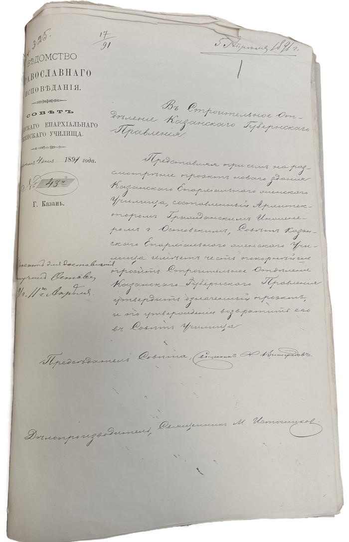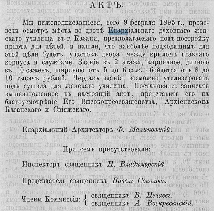 "1899 года февраля 17-го дня. Съѣздъ оо. благочинныхъ Казанской Епархіи, выслушавъ предложеніе Его Высокопреосвященства о неотложной надобности преобразованія трехкласснаго епархіальнаго женскаго училища въ шестиклассное въ наступающемъ 1899—1900 учебномъ году, для каковой цѣли требуется увеличить зданіе училища посредствомъ пристройки или надстройки въ текущемъ же лѣтѣ,. на что потребуется до 30,000 р".