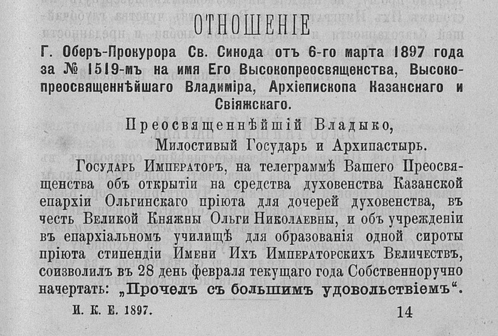 "Открытие Олгинскаго приюта- школы. По поводу освященія Ольгинскаго пріюта (о чемъ см. выше стр. 120) въ мѣстныхъ газетахъ пишутъ. После молебна Его Высокопреосвященство, В. И. Заусайловъ и др. лица, бывшія на торжествѣ открытая, подписали въ пользу Ольгинскаго пріюта- школы свыше 400 руб.. что съ прежде поступившими пожертвованіями (отъ архіепископа Владиміра 1000 руб., Данилова М. М. 200 р. и отъ жены священника О. И. Молчановой— 100 руб.) составило основной капиталъ пріюта пъ 1710 руб. Оо. благочинные на послѣднемъ засѣданіи съѣзда 18 февраля постановили учредить отъ Епархіальнаго духовенства стииендію Имени Ихъ Императорскихъ Величествъ для образованія одной изъ сиротъ пріюта въ епархіальномъ училищѣ, пожертвовавъ на это необходимую сумму денегъ изъ собственныхъ средствъ. Новый пріютъ-школа имѣетъ нѣкоторыя особенности, отличающія его отъ другихъ подобныхъ епархіальныхъ пріютовъ. По проекту устава первоначальное образованіе воспитанницы пріюта получаютъ въ образцовой школе, которая имеетъ быть открыта въ пріютскомъ зданіи (на Ново-Ком. ул ) спеціально для обученія пріютокъ и для учительской практики старшихъ воспитанницъ Епархіальнаго женскаго училища. Лучшія по успѣхамъ и поведенію дѣвочки, по окончаніи образцовой школы, будутъ продолжать свое образованіе въ епархіальномъ училищѣ. Дѣвочки, окончившія курсъ образцовой школы и не удостоенныя перевода въ 1-й классъ епарх. училища, въ рукодѣльномъ классѣ будутъ спеціально изучать рукодѣліе по обширной и разнообразной программѣ, а также домашнее хозяйство. Курсъ обученія въ рукодѣльномъ классѣ трехлѣтній. Пріютъ назначается для призренія и воспитанія 40 девочекъ-сиротъ духовенства Казанской епархіи. Прошенія о принятіи сиротъ, въ возрастѣ отъ 7 до 12 лѣтъ, съ метрическими выписями о рожденіи и крещеніи и свидѣтелъствами мѣстныхъ оо. благочинныхъ о бедности, подаются въ Советъ Епархіальнаго женскаго училища до 15 апрѣля сего 1897 года".