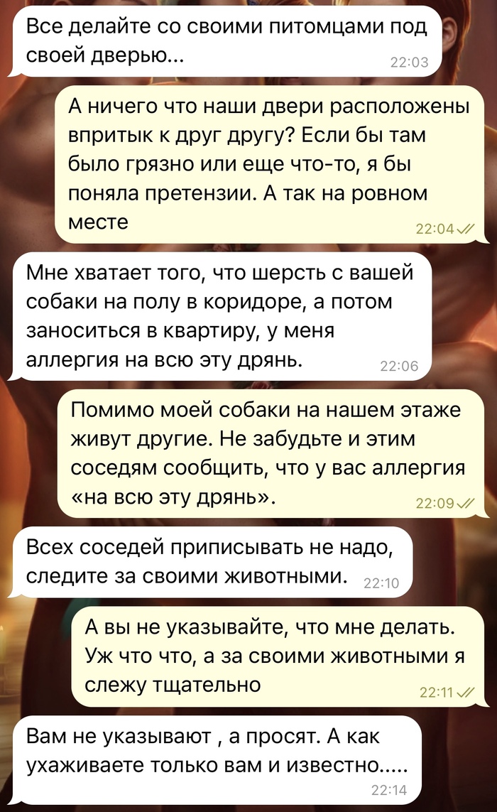 Возвращались вчера домой с собакой, которая в силу возраста стала плохо видеть, и вместо нашей двери она прошла к соседней, я буквально на несколько секунд наклонилась расстегнуть ей шлейку и вот что из этого вышло. Позже вечером мне прилетают сообщения от соседки, скрины прилагаю. Сказать, что я была в шоке, это ничего не сказать!