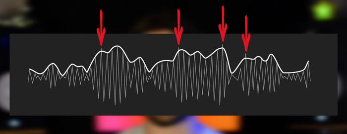 Как я говорил в видео/статье о компрессоре, он срабатывает не по абсолютной величине звуковой волны, а по огибающей. У этого есть минус - огибающая не точно описывает кривую, и в определенный момент времени кривая может выйти за пределы порога, в то время как огибающая ещё останется ниже порога - компрессор не сработает, и часть звука пройдет дальше: