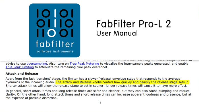 Также на приборе может присутствовать ручка атаки (как у 1176 например). Если вы будете использовать популярный плагин от fabfilter pro-l2, то надо понимать, что атака не работает здесь так как вы ожидаете от компрессора. Здесь релиз разбит на две составляющие "атаку" и "релиз". В таком случае эти параметры регулируют, насколько быстро и интенсивно наступает релиз: