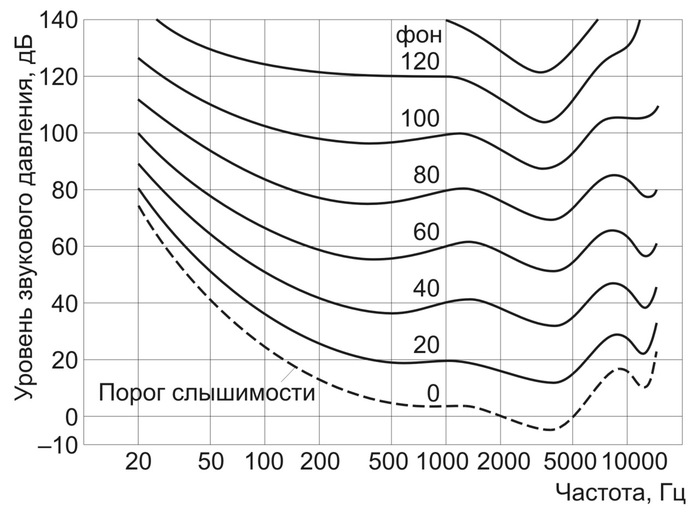 Оно обычно отображается в дБ или дБu. Это чисто математическая модель громкости. Она быстрая, в целом удобная, но не достаточно хорошо описывает слышимую людьми громкость. Мы слышим не все частоты одинаково. Эта нелинейность слуха отражается на таком графике: