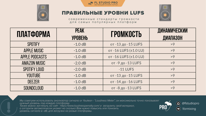 У многих возникает вопрос: какая должна быть громкость у трека? На мой взгляд здесь нет правильного ответа. Разные площадки дают некоторые либо ограничения либо рекомендации по громкости в LUFS: