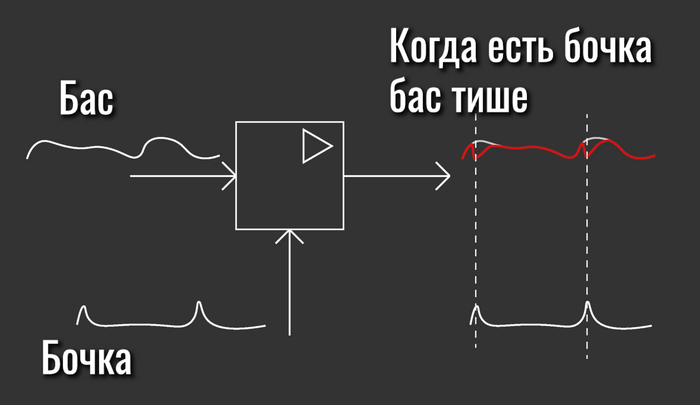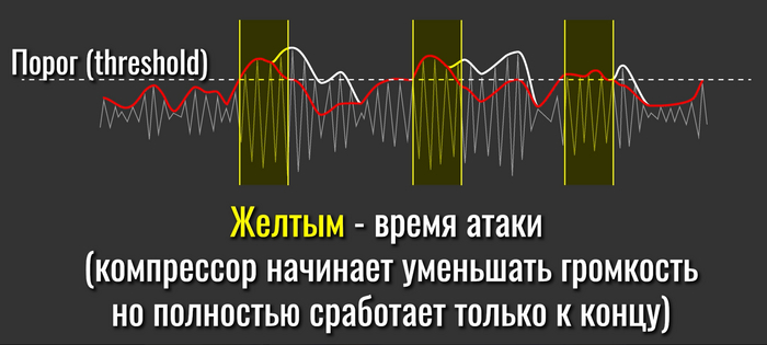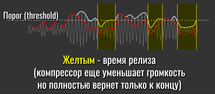 В таких случаях можно использовать динамический эквалайзер. Он реагирует на изменение громкости частоты, на которую применён фильтр. Если громкость проходит через пороговое значение, то усиление фильтра изменяется. Чем дальше за пороговое значение уходит сигнал, тем сильнее меняется усиление фильтра. То есть сам сигнал, который мы подаём на эквалайзер, влияет на усиление фильтра.