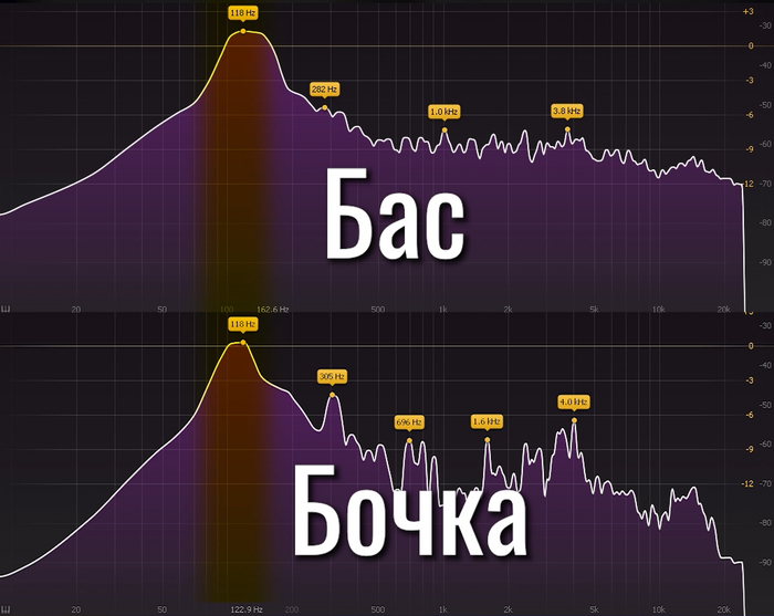 В этом случае ещё можно понять амплитуду, но частота уже не так очевидна. Это связано с тем, что звук, который мы слышим в повседневной жизни, состоит из множества частот с разной громкостью. Именно этот набор частот, где каждой соответствует своя амплитуда, отображается на спектре сигнала.