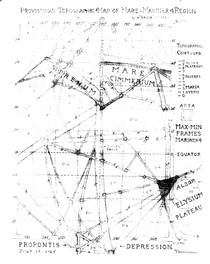 Есть ещё более чумовая иллюстрация: карта Марса (круглая) с местами съёмки космического аппарата Маринер-4, пролетавшего мимо планеты. Места съёмки наложены на карту с "каналами". Но тут мы исходников не нашли, не можем утверждать, что это NASA так видело Марс. Хотя похоже на это.