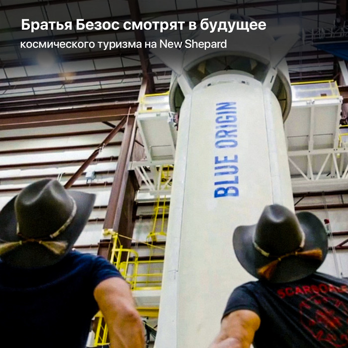 Ракета New Shepard от Blue Origin, полетевшая 20 июля, представляет собой возвращаемую многоразовую первую ступень и, собственно, 6-местную капсулу с пассажирами. Двигатель первой ступени отключился примерно на высоте 50 км и полет продолжился по инерции. Капсула отделилась на высоте 70-80 км, в апогее достигнув высоты 107 км, и начала падение, а пассажиры стали испытывать состояние невесомости. В итоге после 3—4 мин пребывания в нем и непродолжительного падения, на высоте 2 км раскрылись парашюты и капсула благополучно приземлилась (как и несколькими минутами ранее первая ступень). На все про все у Джеффа Безоса ушло 10 с небольшим минут, максимальные перегрузки на подъем составили 3g и кратковременные 5g при спуске.