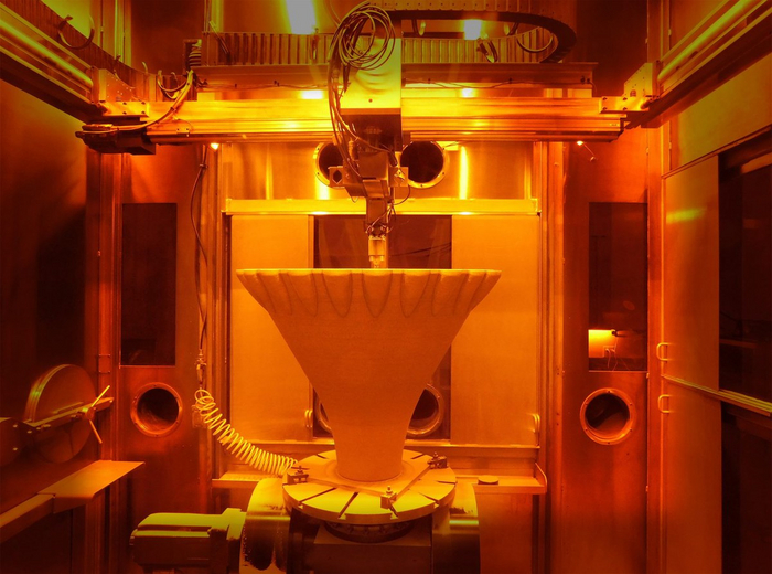 Сопло ракетного двигателя, расположенное в нижней части и имеющее форму колокола, часто охлаждается сверх холодным ракетным топливом, протекающими через него. Это достигается за счет механической обработки каналов внутри стенок сопла и затем возврата их обратно в камеру сгорания двигателя для создания тяги. Эти каналы требуют сотни, если не тысячи, отдельных компонентов, что, естественно, усложняет процесс производства и увеличивает как стоимость, так и вес.