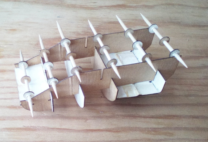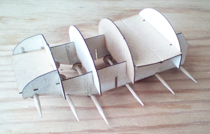 "Шашлычница" из катков. Вообще планировалось по 4 катка на "шампур". Но часть деталей плохо прорезалась и решил не заморачиваться. Всё равно потом не будет видно.