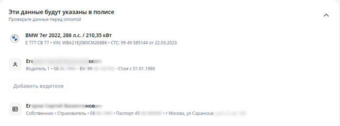 Шутки ради я попробовал вписать туда эти данные и о чудо, мне вышла следующая страница, которая содержала все персональные сведения о водителе и страхователе, включая паспортные данные и адрес.