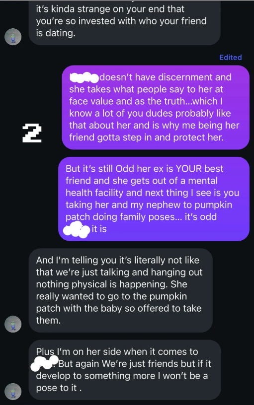 Но все равно странно, что ее бывший — ТВОЙ лучший друг, она выписалась из психиатрической клиники, а в следующий момент я вижу, как ты везешь ее и моего племянника на тыквенную ферму и фотографируешься с ними в семейных позах... Это странно, [замазано].