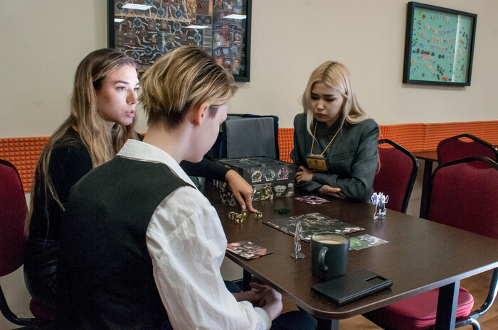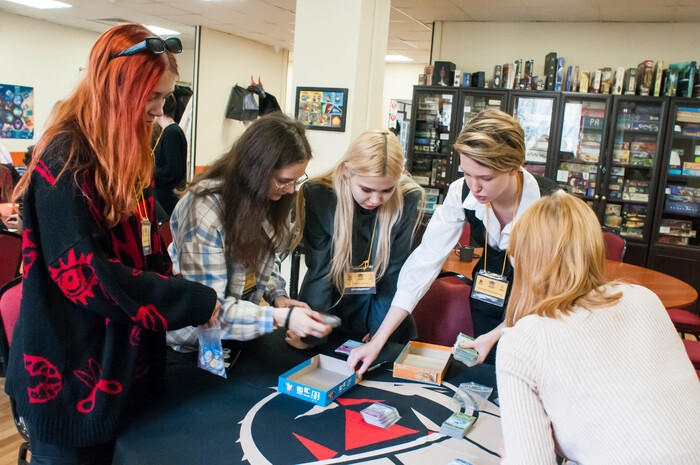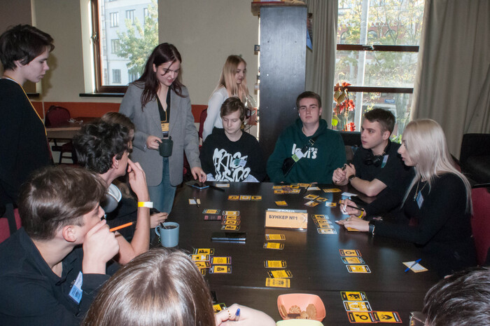 В антикафе и клубе настольных игр TERRA жарко: в смысле прямом и переносном. Идет ожесточенная борьба четырех команд из двух вузов: Российского нового университета (РосНОУ) и Международного юридического института (МЮИ). Это первый межвузовский турнир по «Бункеру», дискуссионной стратегической игре от издательства «Экономикус». Играют команды от 4 до 16 человек. В «Бункере» - по 50 карт профессий и фактов, по 32 карты здоровья, хобби, багажа, особых условий, 10 двусторонних карт катастроф, 21 карта угроз, 30 карт бункера, буклет правил игры и 120 листов бланков голосования. Игроки получают несколько случайных карт характеристик: пол и возраст, профессия, здоровье,хобби и др. Постепенно они раскрывают свои карты, знакомятся друг с другом, а затем следует голосование: команды принимают решения, кто поможет выжить и продолжить род, а где сидит самое слабое звено и первый кандидат «на вылет».