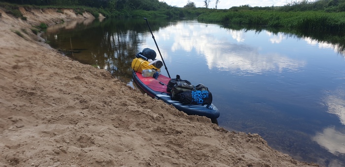 144 км от старта, а.г. Морино Ивьевского р-на. В обратном порядке складываю пожитки на сап, и тащу за корму по отмели на более глубокое место.