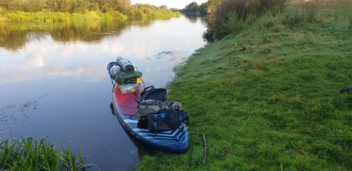 Сап неказистый, Gladiator Pro 11.4. Багажные кольца на корме клеил кустарно. Мягкий туринговый киль, некий Sup Face, подрезанный по размеру нашего байонета, очень помог впоследствии на множестве отмелей, которыми богат Нёман, более жесткий бы наверняка умер.