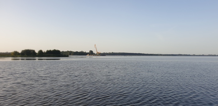 Вот такая шаланда бороздит туда-сюда просторы Гродненского водохранилища, образованного рекой. Где-то там же дрейфует и кран, копающий для неё песочек.