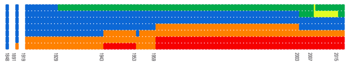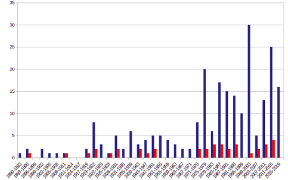 Если мы посмотрим на список всех народных инициатив, мы заметим, что этот инструмент сначала использовался довольно редко. Количество народных инициатив подскочило лишь в 1970-е годы. Картинка ниже показывает количество народных инициатив по избирательным периодам (синим) и количество тех из них, которые были одобрены (красным).
