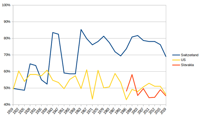 Для сравнения я добавил данные по США и по своей родной Словакии (извините, не удержался). В случае США график показывает долю избирателей, проголосовавших за действующего президента. В случае Словакии это процент людей, проголосовавших за партии правящей коалиции.