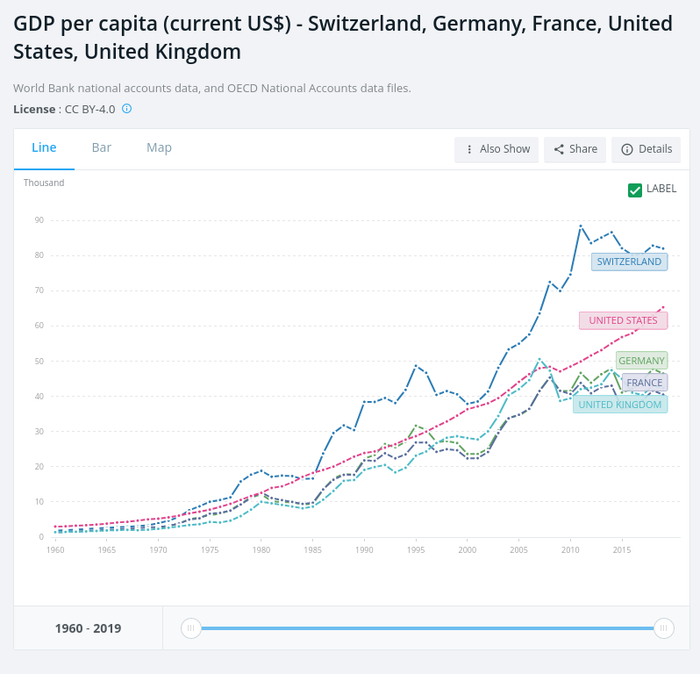 Швейцария сегодня— самая успешная страна мира. Она не только стабильно занимает место в первой тройке стран и по продолжительности жизни, и по субъективному уровню счастья её населения, но и является самой богатой страной мира, не считая пары микрогосударств вроде Лихтенштейна и Монако. По ВВП на душу населения Швейцария примерно вдвое превосходит Германию, Францию и Великобританию, и на треть — США.
