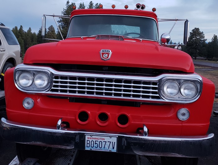 На трейлере сзади синего GMC- красный FORD F1100 конца 50х с двигателем 534 кубических дюйма (8.8 литра).