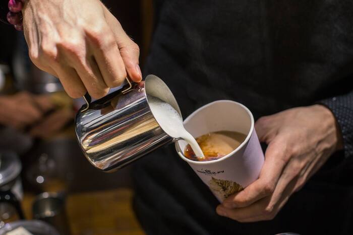 Молоко. Основа нежности. Я взял цельное молоко, жирное и сладковатое. Аккуратно процедил пряно-чайный отвар, удаляя гущу – теперь это был концентрированный, почти черный настой, полный силы и характера. Влил его обратно в чистую кастрюльку, добавил молоко и… волшебную палочку современности – *капучинатор*. Нагревая смесь, я взбивал ее, пока она не начала пениться и наливаться бархатистой текстурой. Мощь пуэра и жар пряностей начали обволакиваться шелковистой нежностью молока. Цвет превратился в восхитительный оттенок топленого карамелизованного какао.