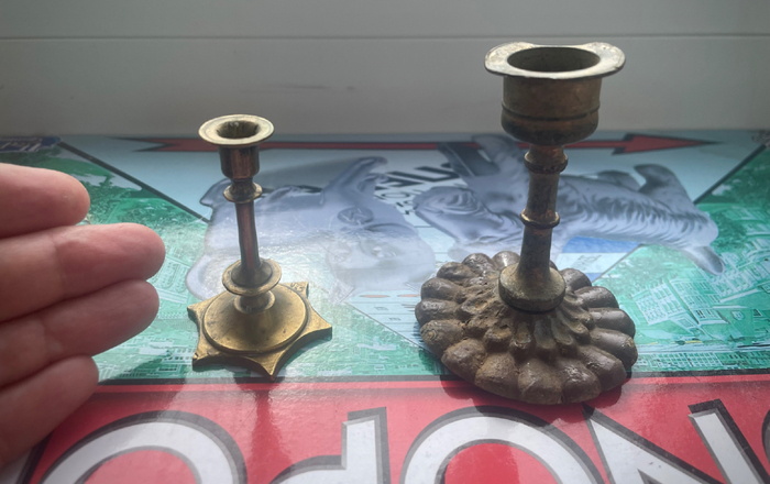 Я и раньше находила маленький подсвечник на чердаке одной из заброшек в Тульской области. Он был с клеймами и в изумительном сохране, но к сожалению, совсем крохотный, так, что я не сразу и поняла, что же это. С тех пор я мечтала о полноразмерном подсвечнике, который я в итоге сама собрала по частям у себя в близлежащих полях. Не надо говорить, что радости моей не было предела! Осталось придумать, как выправить гнутую часть верха старинного светильника и будет красивый коллекционный экземпляр.