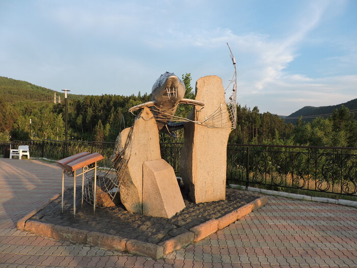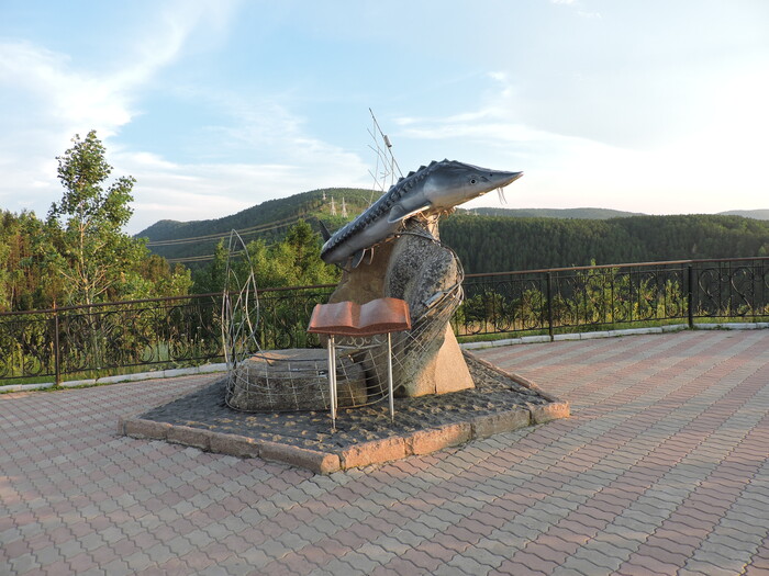 Потом по небольшой лесенке вниз-вверх идёшь к скульптуре осетра, которая установлена в честь повести Виткора Астафьева "Царь-рыба".