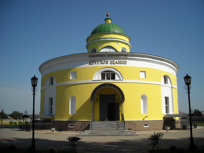 Надпись на камне: Памятник архитектуры XVIII века. Круглое здание. Построено в 1790 году в имении помещиков Хорватов потомков генерал-поручика Ивана Хорвата. Оригинальное решение объёмно-планировочной композиции здания «цилиндр в цилиндре» делает этот памятник уникальным не только для Белгородчины, России, но и всего мира. Первоначальное назначение здания не установлено. Существует несколько версий его предназначения. В XX века использовалось под складские помещения. Второе рождение памятника произошло в 1999 г., когда был создан попечительский совет для проведения работ по реставрации, которые были завершены в 2006 году.