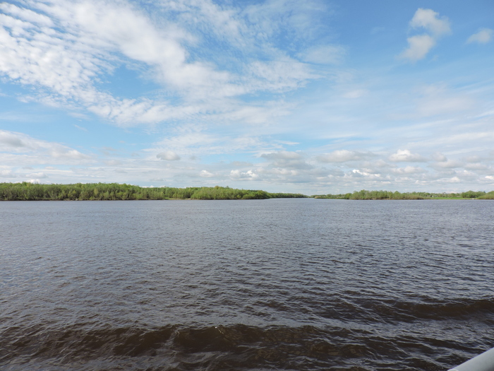 Потом всего три часа - и вы уже в пгт.Андра. Это уже не притока, а сама Обь. Плыть довольно долго, хотя по прямой между Приобьем и Андрой меньше одиннадцати километров. Но паром по прямой не умеет, он из Алёшкинской протоки сначала входит в протоку Малая Обь, и только потом в саму Обь. В результате путь - более сорока километров.