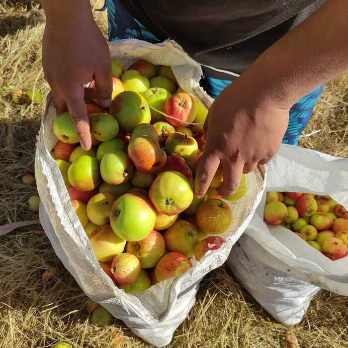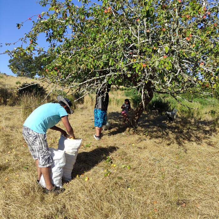 Вместе с детьми, Хаером и Эдуардом, идём на участок собирать яблоки. Чича — это что-то вроде яблочного сидра, для взрослых — забродившего.