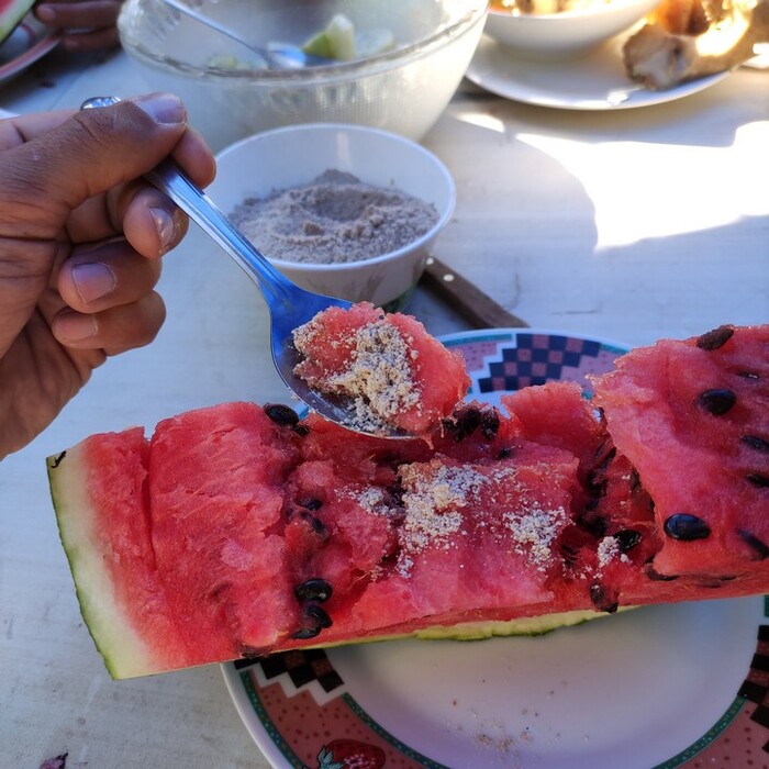 На десерт приносят арбуз, режут на огромные дольки. Любопытная деталь: к нему подают тарелку с панировочными сухарями. Арбуз вприкуску с хлебом.