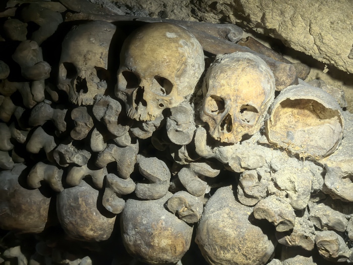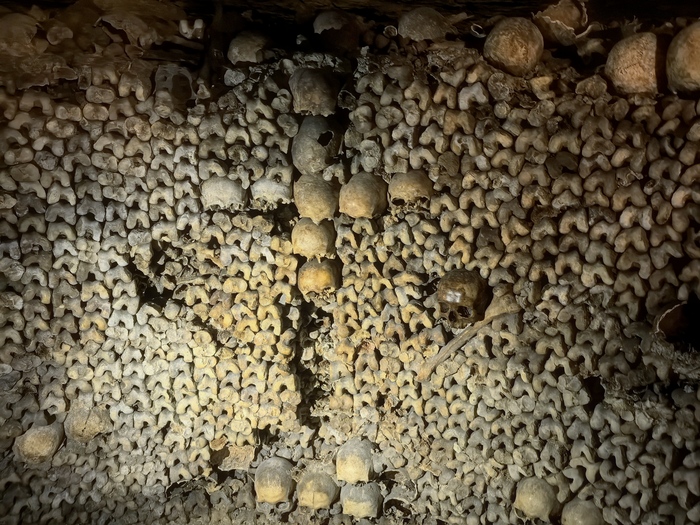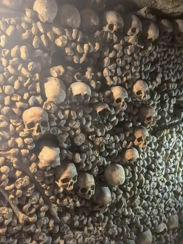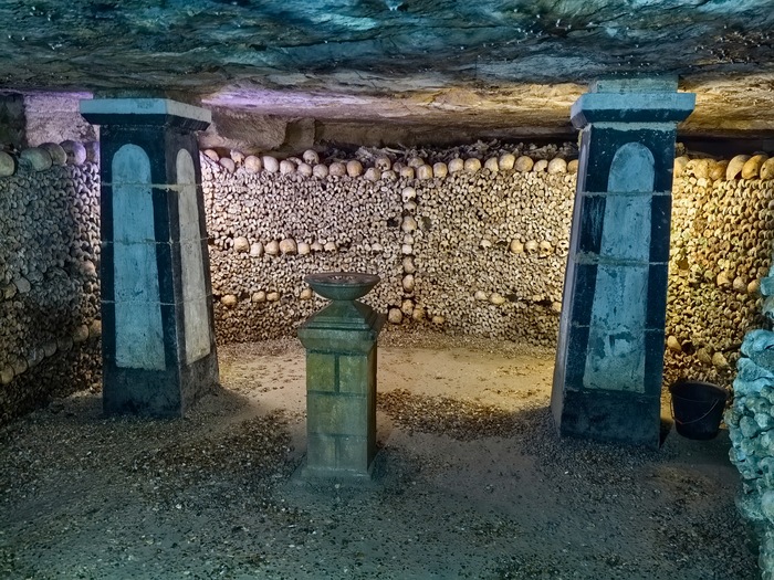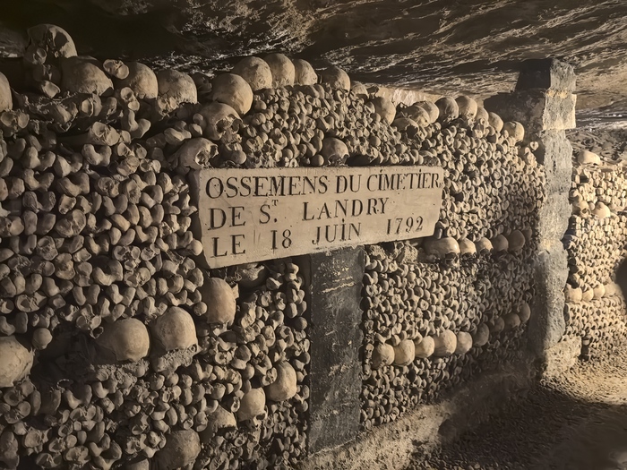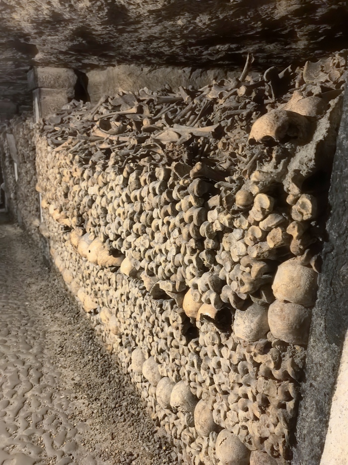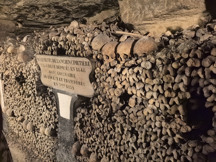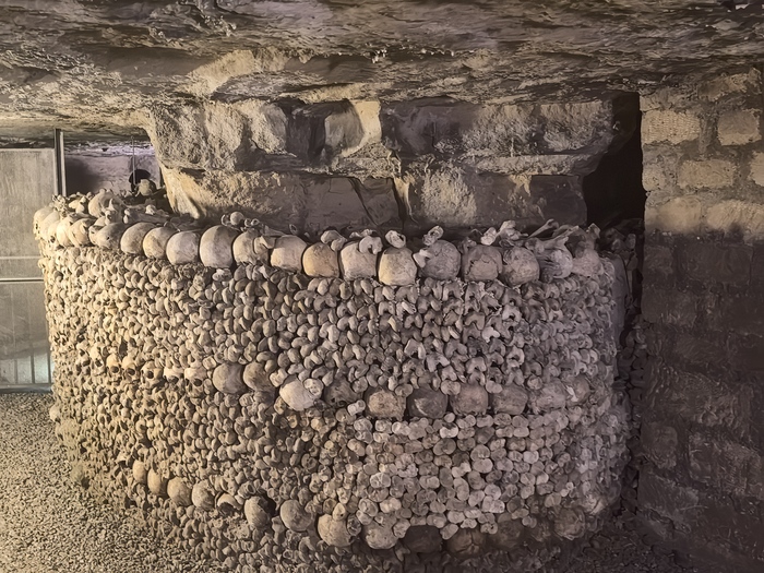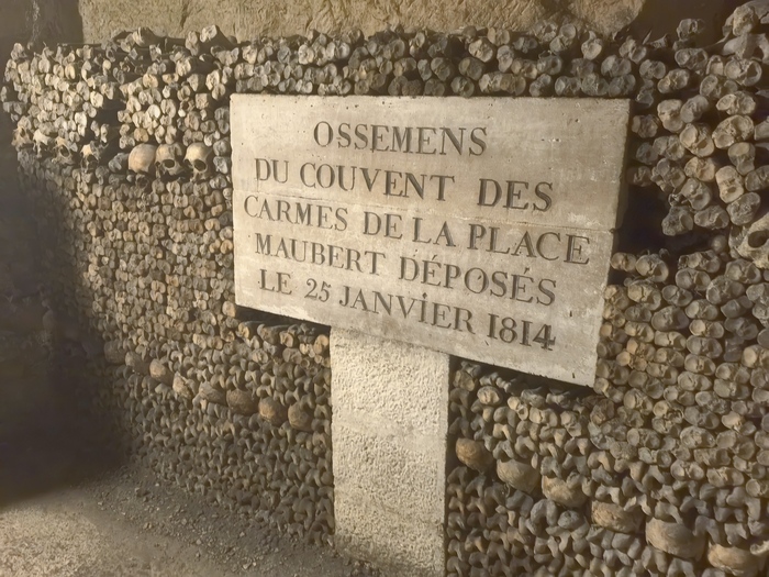 Площадь основной зоны катакомб, доступной для посетителей (костехранилище), составляет около 11 000 квадратных метров (1,1 гектара), где аккуратно сложены кости и черепа примерно 6 миллионов парижан, тогда как общая протяженность всех подземных туннелей-каменоломен под Парижем — от 187 до 300 км . По факту открыта к осмотру довольно маленькая часть
