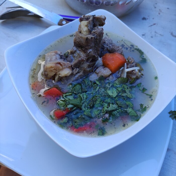 Меня усаживают за стол и угощают густым супом — касуэлой. Похоже на азиатскую шурпу, мясо на кости.