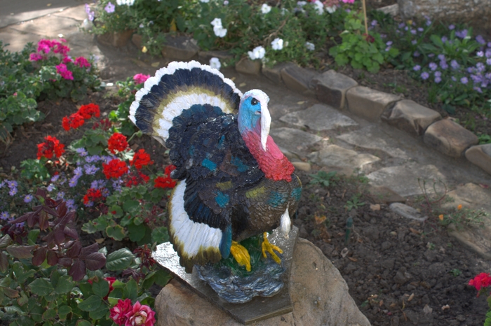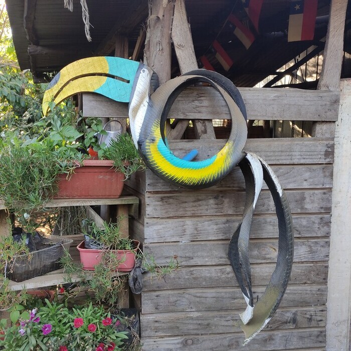 Ферма украшена в тропическом стиле. У нас из покрышек делают лебедей, а здесь — туканов. Кто-то возьмёт на заметку?