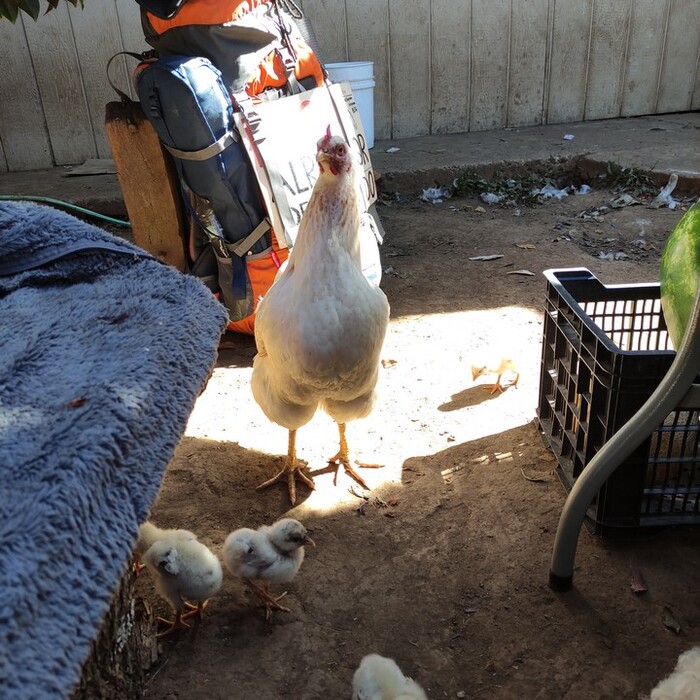 Тем временем меня внимательно изучают местные обитатели. Куры, индюки, неподалеку пасётся осёл. Цыплятки.