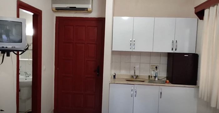 Мы жили в 121 номере, рядом с ресепшен: 2 комнаты, холодильник (как выяснилось позже, он не охлаждал от слова совсем), небольшая зона для готовки (раковина + рабочая поверхность, сойдет, чтобы помыть купленные в магазине фрукты и т.д.), шкаф, сейф и старинный телевизор. В одной комнате две соединенные в одну кровати, во второй диван и односпальная кровать. Есть маленькая ванная с душем и феном, где на каждого стояло по одному пузырьку моющего средства.