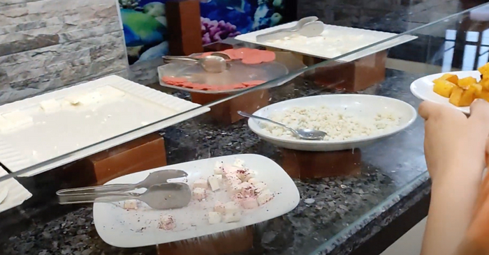 Питание скромное, из мясного периодически бывают колбаски и котлеты, чаще курица, салаты, крем-суп.. Обеды и ужины почти идентичны по ассортименту. На завтраке мне понравились оладьи — ел их все 10 дней)) Было 4 вида сыра, 4 вида оливок, омлет, каша, жареная картошка (вкусная!), некое подобие рагу из нарезанных сосисок в томатном соусе и свежие помидоры, пара видов хлопьев и несколько вариантов варенья. Старайтесь приходить к открытию или не позднее середины завтрака, так как к закрытию половины блюд уже не будет.