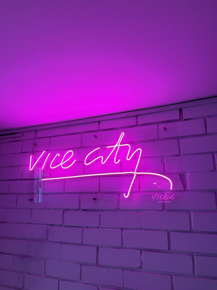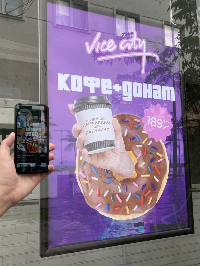 Посмотрев "рюмку", решаем неспешно идти в сторону реки Лазурь. Отойдя буквально 50 метров от "рюмки" я увидел неоновую розовую вывеску Vice City и баннер на стекле со шрифтом в стиле GTA Vice City!!! Матерь божья RockStar Games! Нихерасе как сработал триггер на флешбэки из детства, как ночами я залипал в эту топовую игру! Естественно, я не смог не зайти!