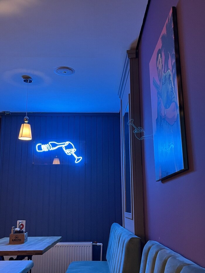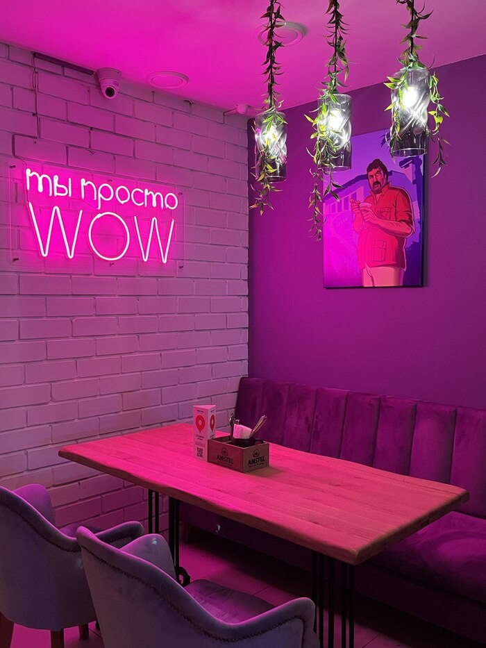 Внутри антураж воссоздан как в игре - неоновые надписи, арт-картинки из игры и бар.