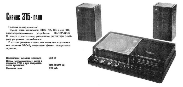 Монофоническая аппаратура доминировала на советском рынке вплоть до конца 70-х. Причина не в технической отсталости производства, а в ценовом вопросе. Радиоэлектронная стереофоническая схема — это дважды продублированная монофоническая. То есть начинка стереоаппарата стоила в два раза дороже монофонического. А начинка в те времена отжирала львиную долю себестоимости. Стерео получалось дорогим.Поэтому появлялись компромиссные аппараты. В 1978 году в Ижевске вышел редкий зверь — монофоническая радиола с имитацией стерео, тогда это звали псевдостерео, квази-стерео или пано. Аппарат был чисто транзисторный и носил название «Сириус 315-пано». Не сказать, что он пользовался дикой популярностью, сейчас такой встретить трудновато.