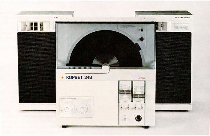 Совсем экзотикой в магазинах выглядел «Корвет ЭФ-248 стерео». Вертикальная вертушка! Очень пижонская вещь для самых смелых. Их выпускал завод «Ладога» в городе Кирове. Характеристики были отличные, электроника навороченная, да и цена приемлемая — 250 рублей.