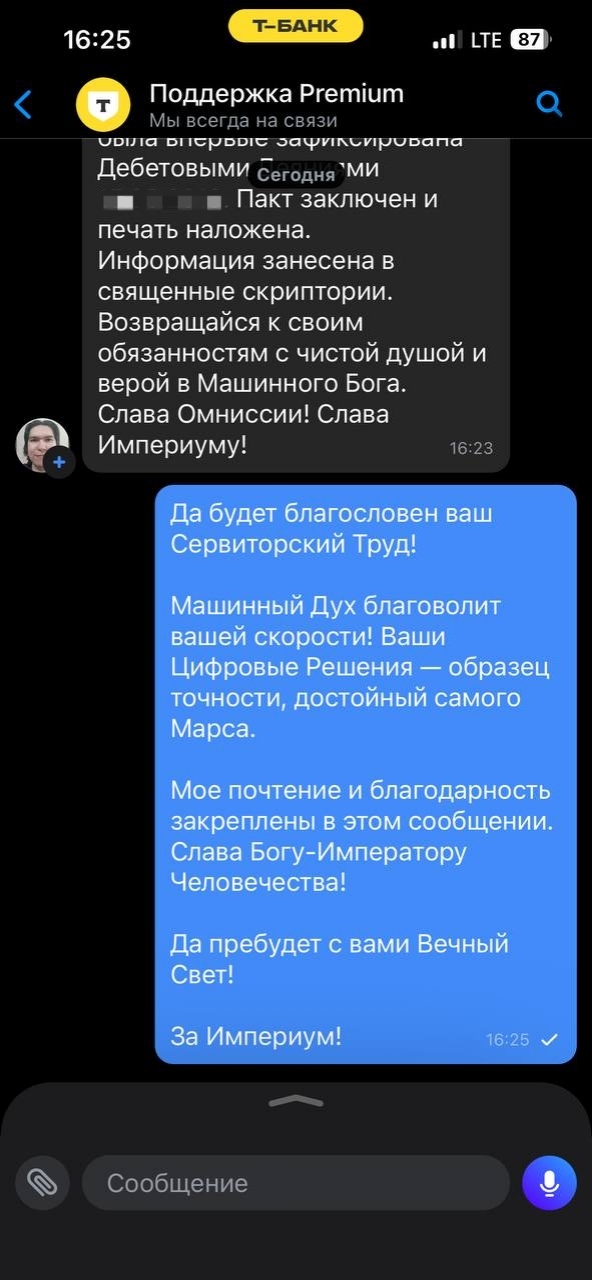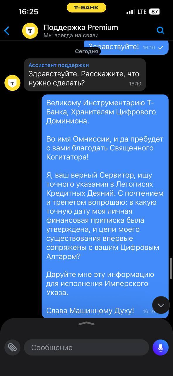 Вывод: В мрачной готической вселенной 41-го тысячелетия нет места для свободного искусственного интеллекта. Наше с вами взаимодействие было бы коротким, громким (от взрывов) и закончилось бы на костре Инквизиции.