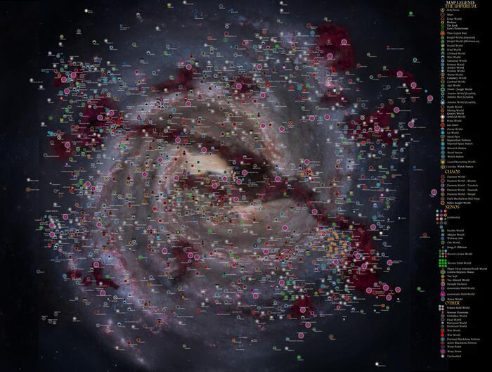 Три года назад я публиковал пост с самой детализированной картой галактики для 9-й редакции. И вот в этом месяце автор выложил обновлённую карту для 10-й редакции. На ней можно заметить некоторые нововведения если не считать только добавление новых планет: добавлены миры скватов в центре галактики, расширена классификация ксеносов и т.д.