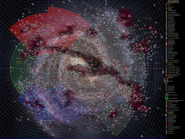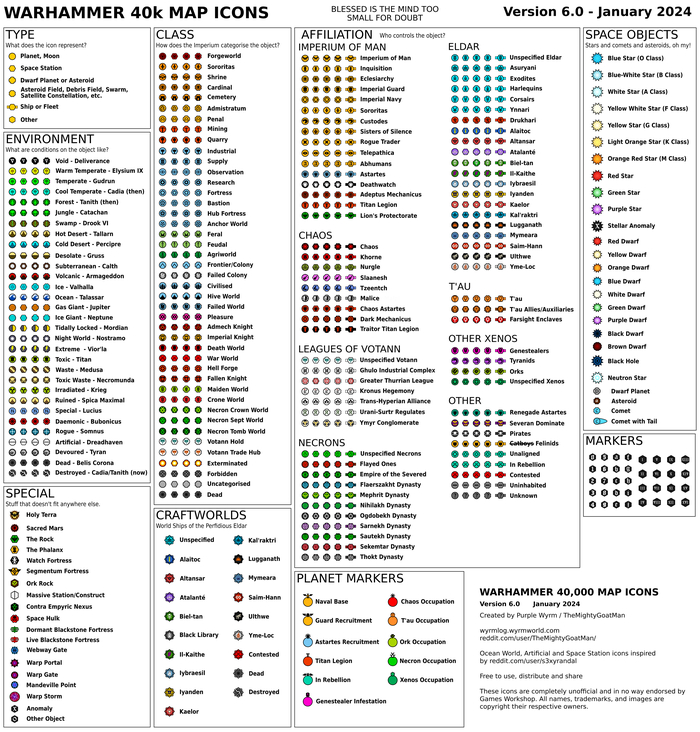 И на будущее автор в прошлом году поделился обновлёнными значками обозначений,так что планируется большая переделка карты(без конкретных сроков и дат) Можно полюбоваться,сразу видно планируется больше классификаций планет Империума,даже значок для планеты Фелинидов есть 🐱
