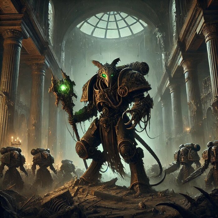 Тёмные коридоры катакомб Скверноскавена извиваются как бесконечные подземные змеи, пахнущие плесенью и варп-камнем. Их стены, покрытые липким мхом и копотью, дрожат от отдалённых звуков работающих машин и приглушённых вспышек варп-огня. Тусклые зелёные светильники, горящие на варп-топливе, едва освещают путь, проливая мерцающий свет на две худые, изогнутые фигуры — Вермесса Инфекции и Фиксита Клыкореза. Они крадутся вдоль стены, избегая главных проходов, чтобы их разговор остался незамеченным.