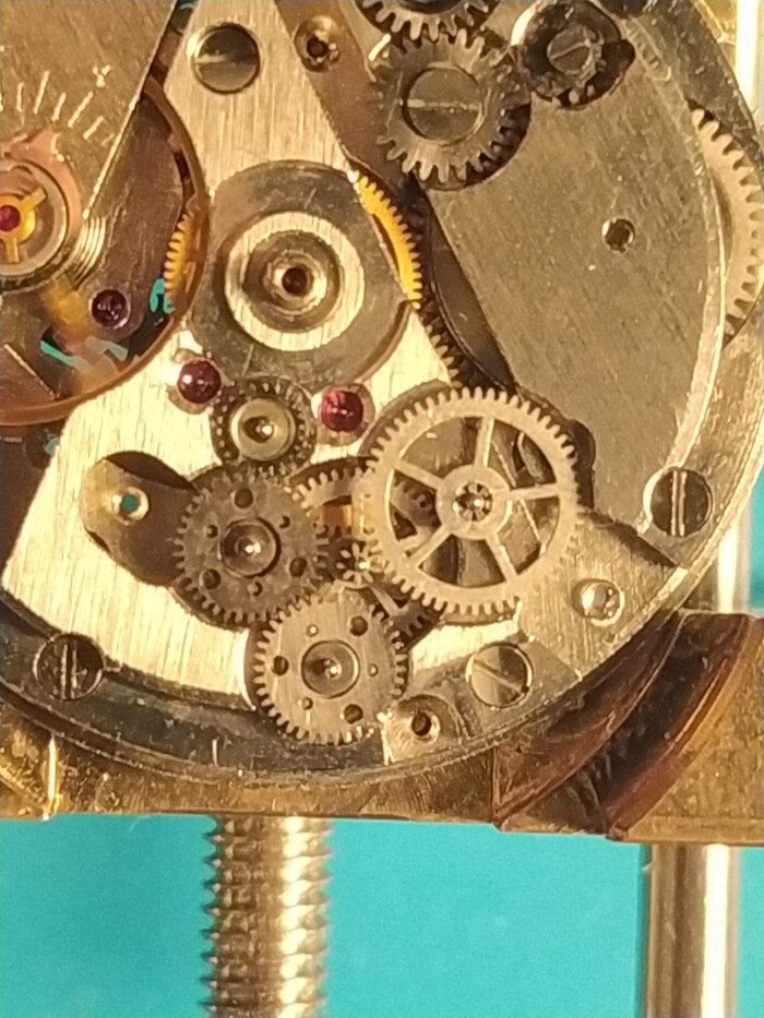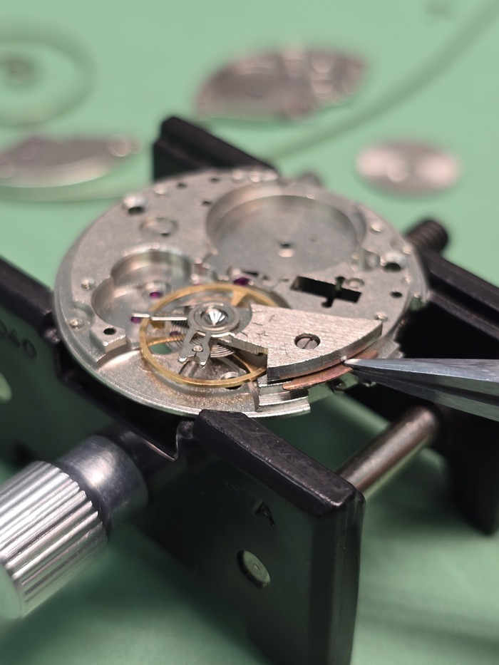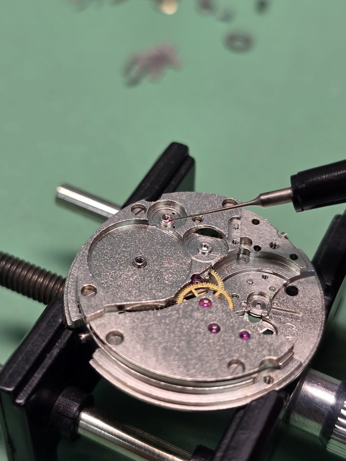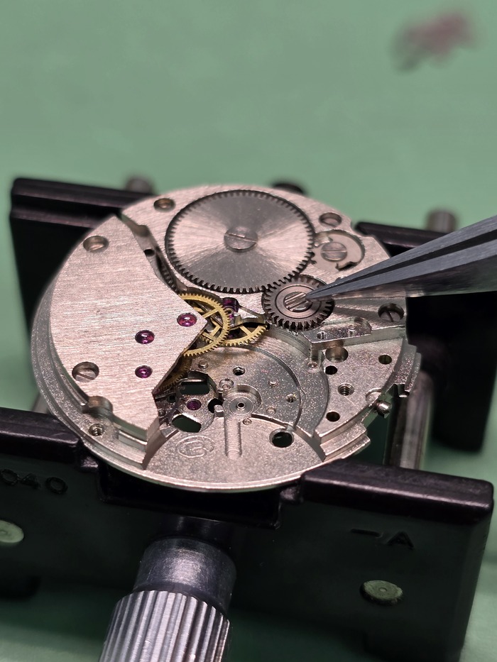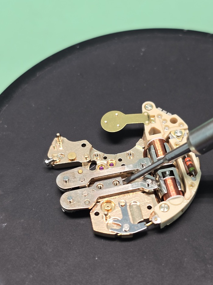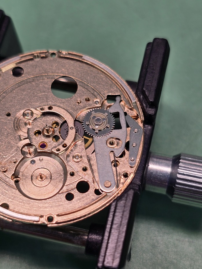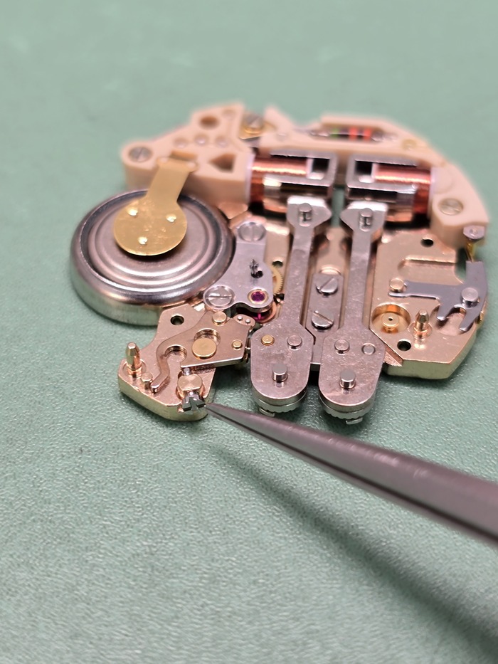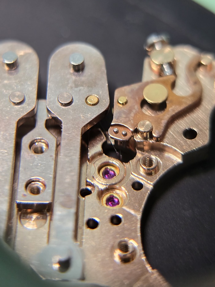 Добавляем оставшиеся детали и фазируем работу индексного механизма вот этим винтом, чтобы часы не спешили в два раза и шли стабильно.