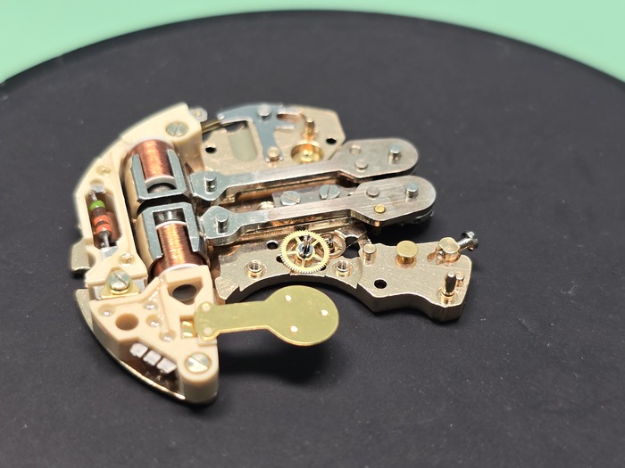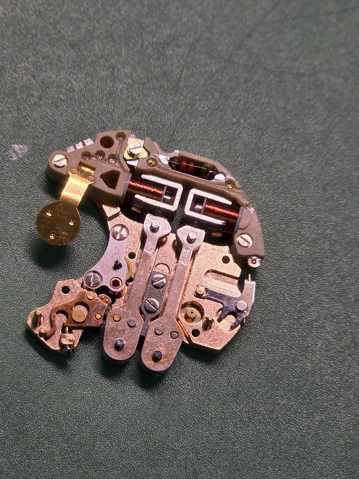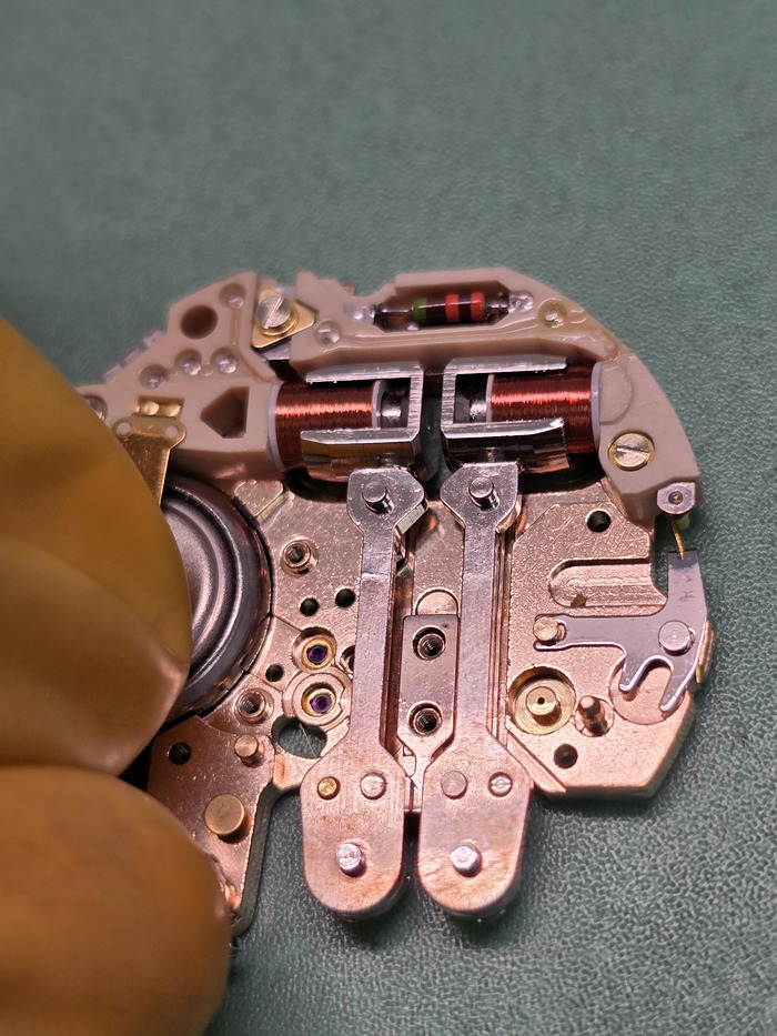 Хорошо видно две катушки, камертонную вилку и мостик индексного колеса.